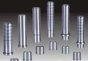 二:导柱的作用导柱是用于模具中与组件组合使用确保模具以精准的定位进行活动引导模具行程的导向元件。导柱的材质一般选用轴承钢、热作模具钢、易车铁等,而以轴承钢SUJ2的使用量较大,使导柱在导向性能上的耐用性与可换性大大加强。导柱与组件组成外导柱组件与内导柱组件,具有美丽的金属光泽。导柱的圆度是有很高的要求的,打中心孔主要是为了能使用外圆磨床研磨外径,因为使用外圆磨床研磨外径的时候要用顶尖顶住中心孔使导柱旋转才可以研磨。导柱热处理:HRC58-62;导柱表面粗糙度:Ra0.8、Ra1.6 导柱一般是带肩圆柱形,一般会有油槽,油槽的数量随着导柱的程度加长而增加,极限最多的油槽一般是8个。汽车模具标准件中的导套常用作钻和镗,一般钻孔用的叫钻套,镗孔用的叫刀杆导套,作用是管住钻头或刀杆在切削时不会跑偏,以提高被加工孔的尺寸精度和位置精度。